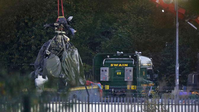 Crane mengevakuasi bangkai helikopter dari lokasi kecelakaan yang menewaskan pemilik Leicester City Vichai Srivaddhanaprabha di Leicester, Inggris, Kamis (1/11). Vichai dimakamkan di kampung halamannya, Thailand. (Aaron Chown/PA via AP)