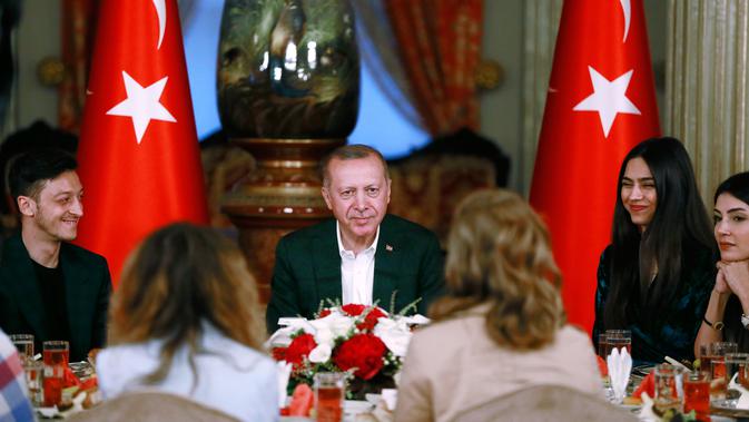 Gelandang Arsenal, Mesut Ozil didampingi kekasihnya Amine Gulse berbicang dengan Presiden Turki Recep Tayyip Erdogan saat menghadiri acara buka puasa bersama di Istana Dolmabahce, Istanbul, Turki (19/5). (Stringer/Turkish President's Press Office/AFP)