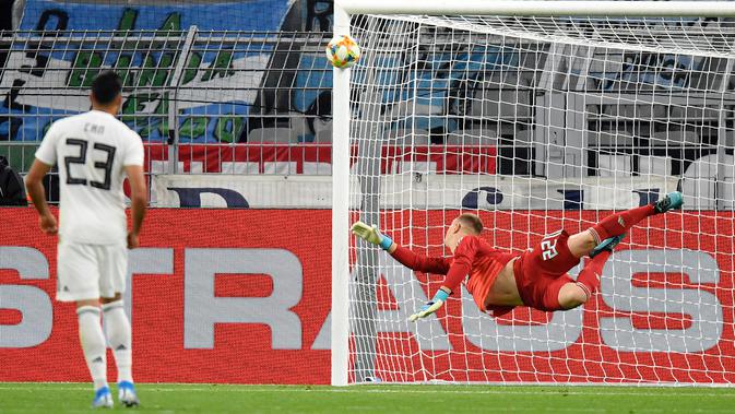 Bintang muda timnas Jerman, Julian Brandt, melompat saat berebut bola dengan pemain Timnas Argentina Nicolas Tagliafico dalam laga persahabatan di Stadion Signal Iduna Park, Dortmund, Rabu (9/10/2019). Menghadapi Argentina, Timnas Jerman harus puas bermain 2-2 dengan lawannya. (AP/Martin Meissner)