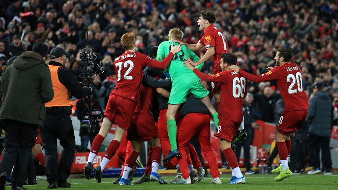 Striker Liverpool, Divock Origi berselebrasi dengan rekannya, Rhian Brewster setelah mencetak gol ke gawang Arsenal pada laga babak 16 Besar Carabao Cup di Anfield Stadium, Rabu (30/10/2019). Berimbang 5-5 di waktu normal, Liverpool menang 5-4 dalam adu penalti. (AP/Jon Super)