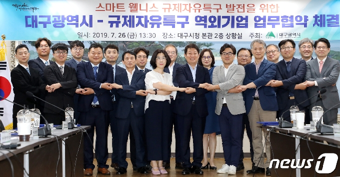 | 26일 오후 대구시청 본관 상황실에서 열린 '대구시-규제자유특구 역외기업 업무협약 체결식'에서 권영진 대구시장과 대구 스마트 웰니스 규제자유특구에 참여하는 역외유치 특구사업자 14개 기업(스마트 임상·웰니스 정보서비스·공동제조소) 대표 등 참석자들이 손을 맞잡고 있다. 2019.7.26/뉴스1 © News1 공정식 기자 |