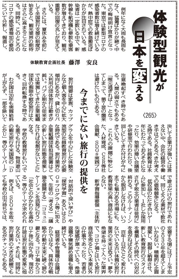 からの記事と詳細 ( 【体験型観光が日本を変える265】今までにない旅行の提供を 藤澤安良 | - 観光経済新聞 )