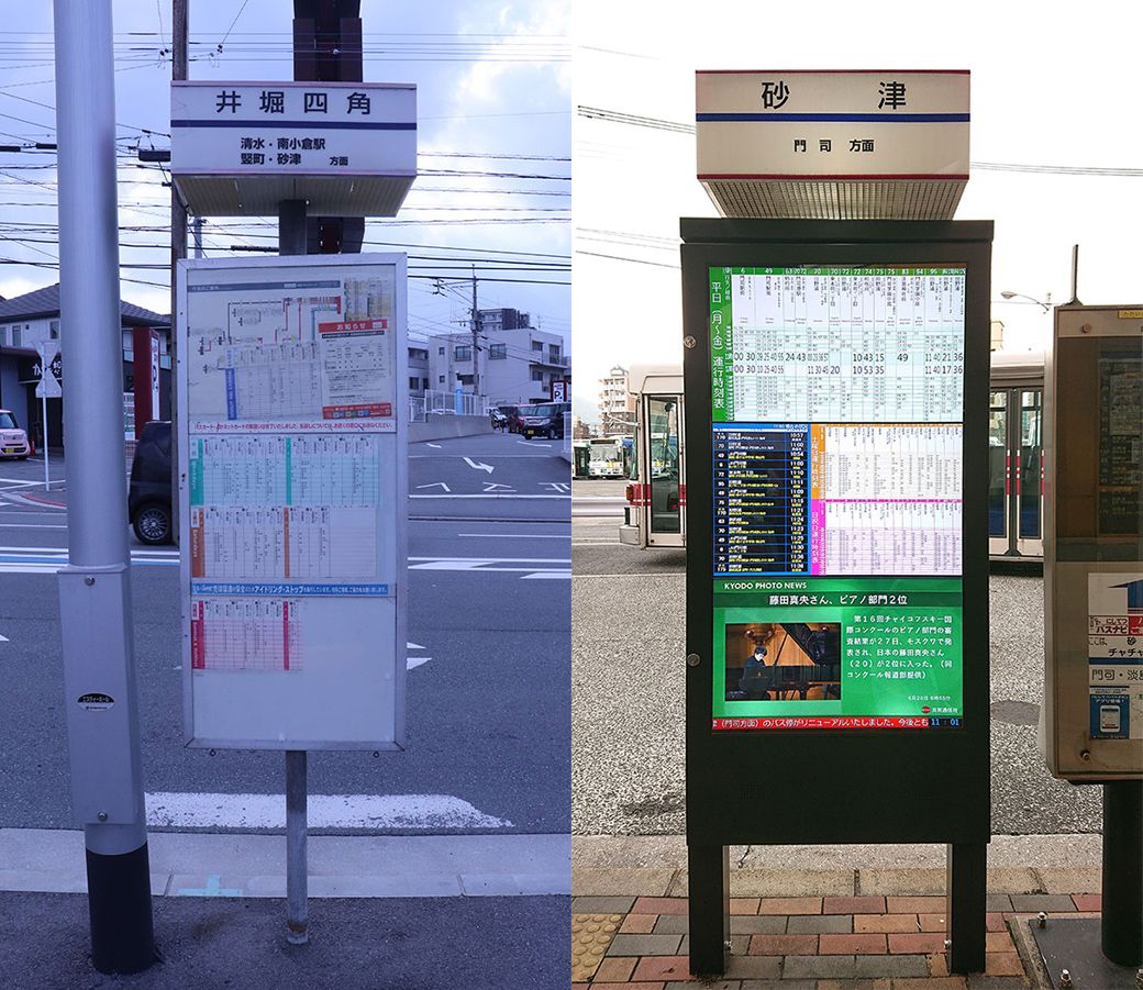 左が従来のバス停。右が「スマートバス停」。バスの接近情報や時刻表、広告などがデジタル表示される(画像提供/YEデジタル)