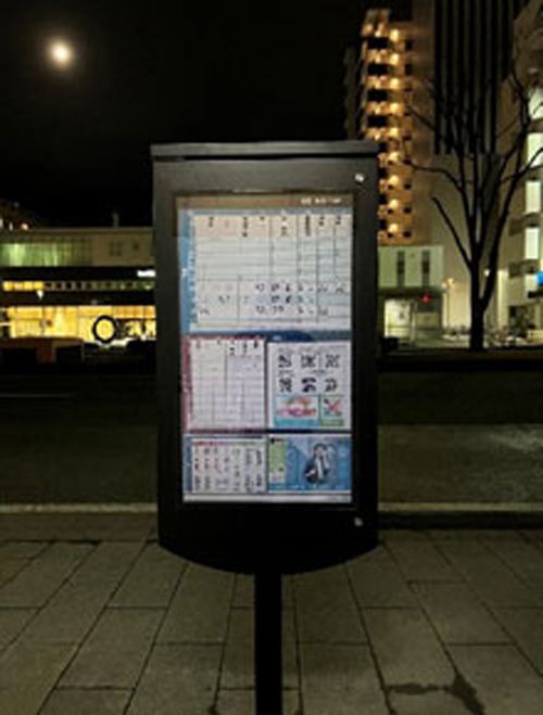 『スマートバス停』は、反射型液晶という超低消費電力技術を用いたディスプレイに、太陽光発電パネルとバッテリーを組み合わせることで電源を必要としないなど、設置環境やニーズに合わせて選べる複数のモデルをご用意しています。そのため、給電しにくい郊外部にも設置が可能になりました。反射型液晶を使った郊外モデルでは、昼は太陽光の反射を活かし、夜間にはバックライトを使って電灯がない所でも高い視認性を保つことができます」(筒井さん)