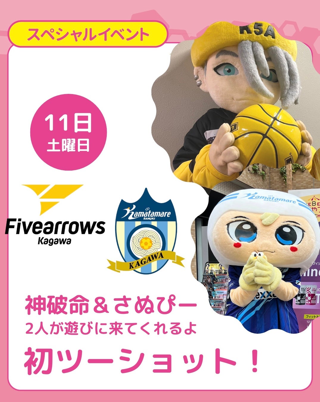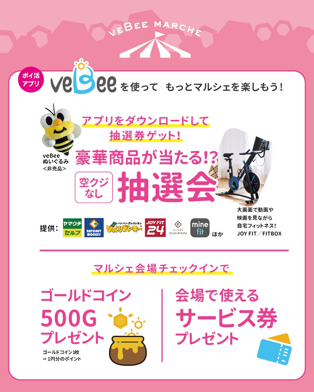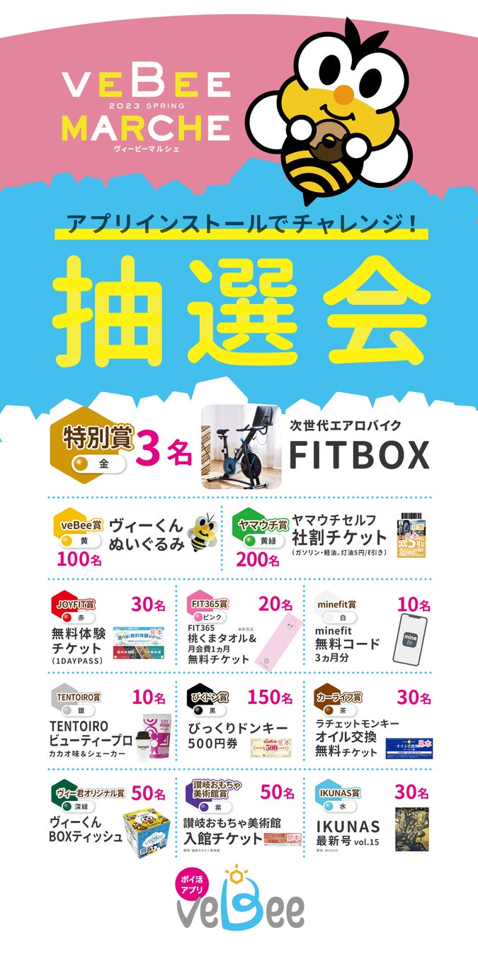 内容:ポイ活アプリveBeeのPRイベント。県内の人気飲食店や雑貨店、リラクゼーションやワークショップなどを一堂に集めたマルシェを開催。アプリユーザーには豪華景品が当たる抽選会や、マルシェで使える商品券のミニゲームブース他を用意。さらに、身体美容家として活躍中の優木まおみさんをお迎えして、「ポイ活&ビューティーのトークイベント」を開催。香川ファイブアローズの公式マスコット神破命とカママタマーレ讃岐の公式マスコットさぬぴーも来場。讃岐おもちゃ美術館の木育ひろばもあり、小さなお子様から大人まで楽しめる内容となっている。