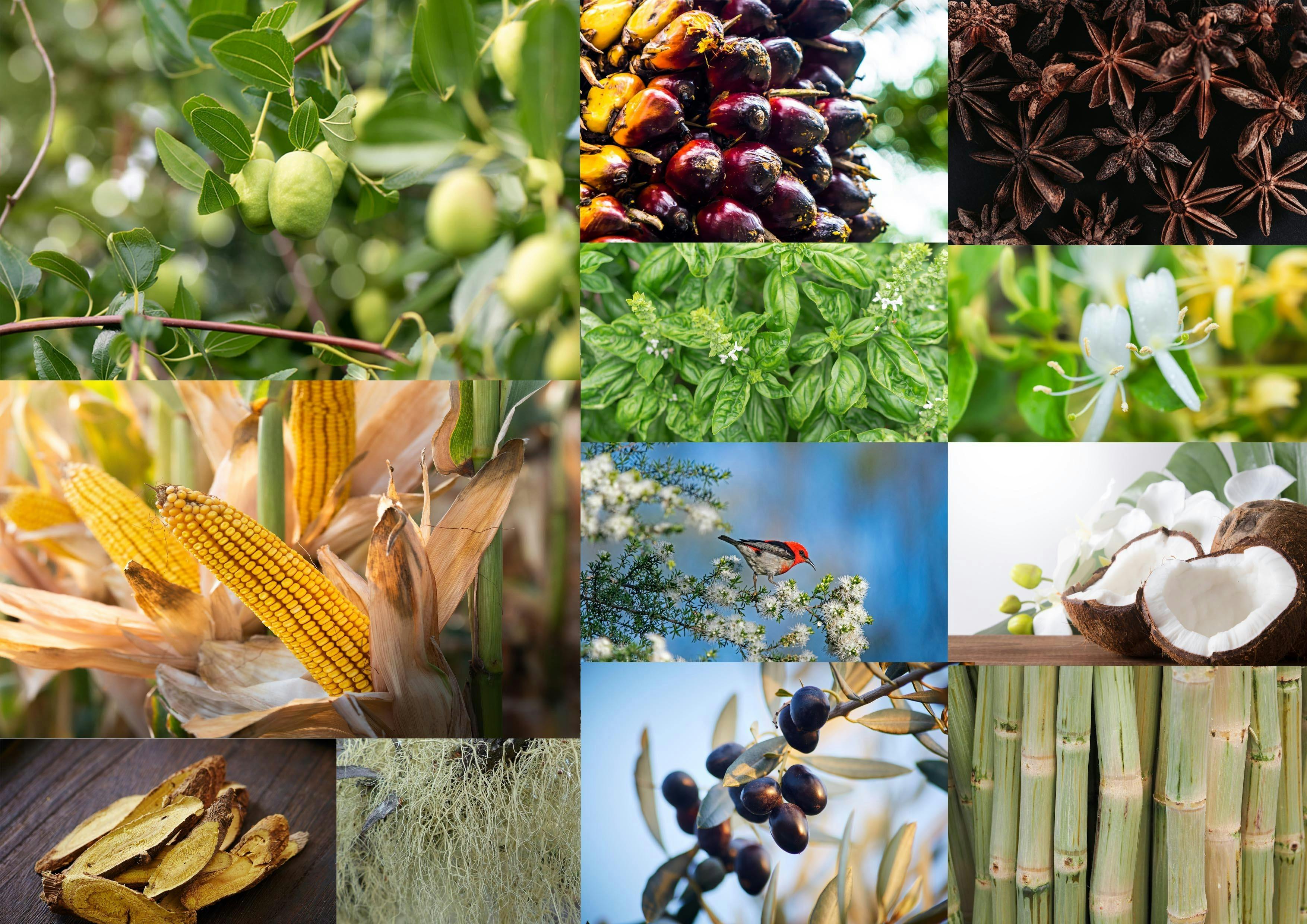 ホホバ 油ヤシ ダイウイキョウ メボウキ スイカズラ トウモロコシ クンゼア ココナッツ 甘草 ウスニアバルバタ オリーブ サトウキビ